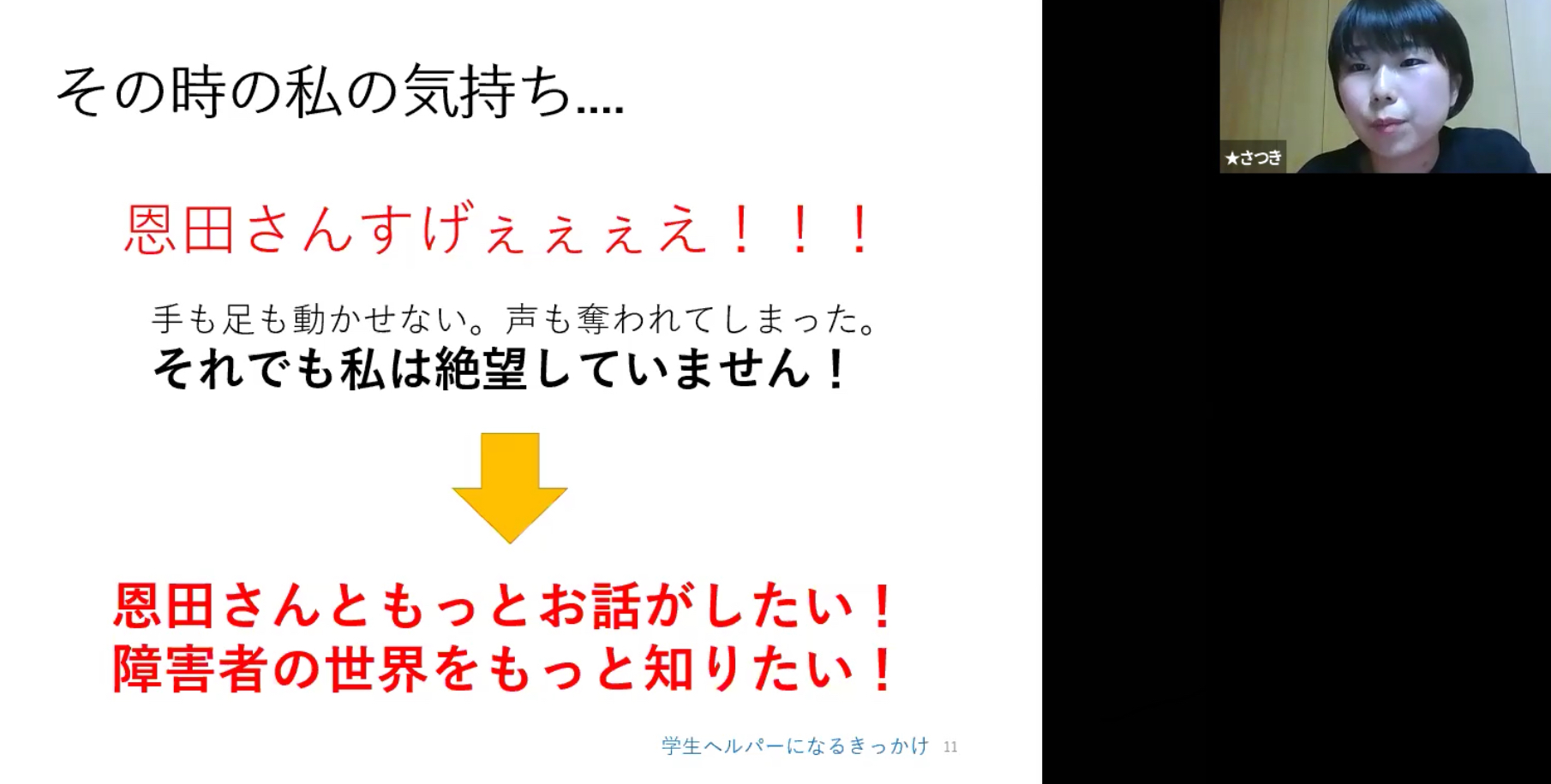「人生は自分を好きになるためにある」という言葉が印象的でした。恩田さんの生き方が学生ヘルパーを引き寄せて、その学生ヘルパーさんも恩田さんに関わることで更にパワーアップされていること。素晴らしい相乗効果だと感じました。」