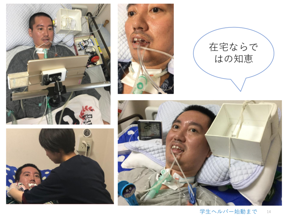 A2、昼間に看護師ケア、リハビリ、訪問入浴などをして夜iPadに向かいます。学生ヘルパーに関しては親だと思って育てています。