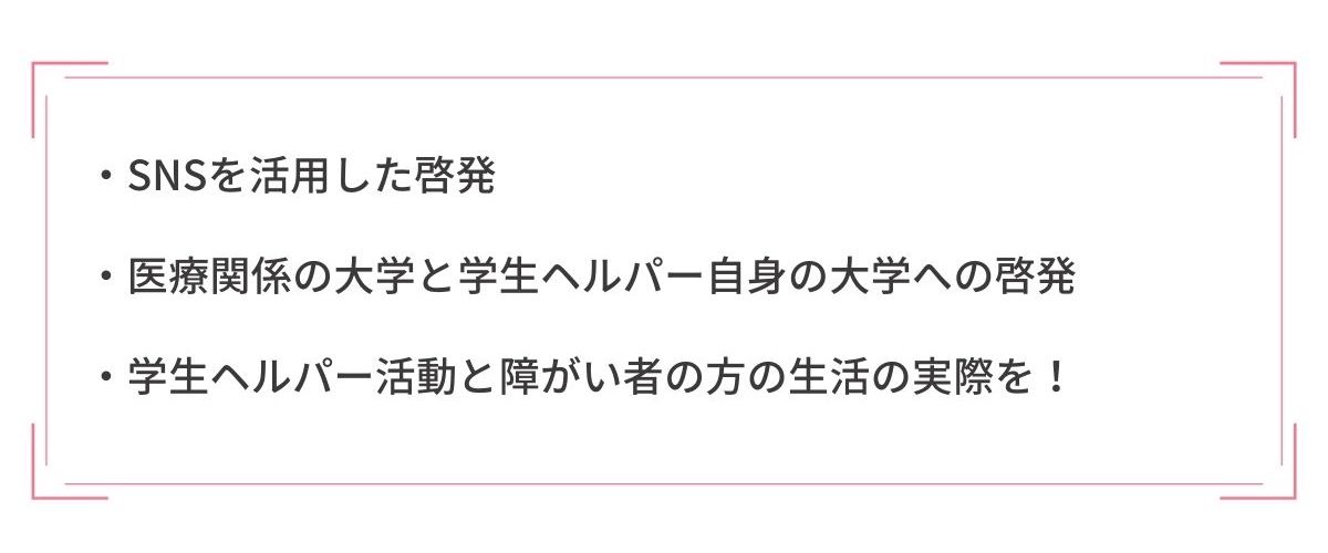 ー学生ヘルパーや重度障害者の方の生活をしれて良かったという声が多くありました。また、実際に活動をしている学生の生の声への反響が大きかったです!