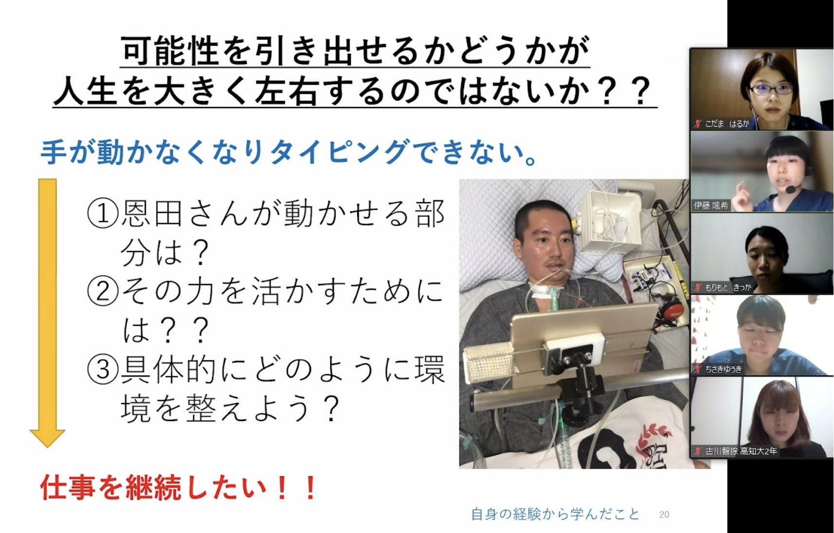 ・ALSの患者さんなどの患者さんが、重い疾患を持ちながらも工夫して生活していらっしゃることについて発信していくことが必要だと思います。