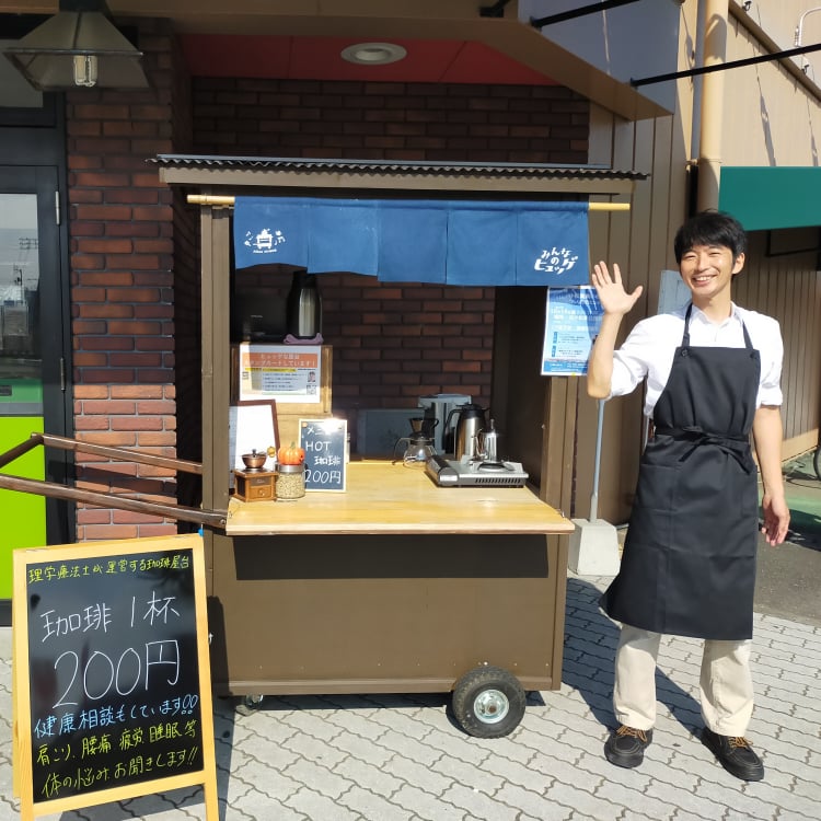 本岡 秀人(もとおか・ひでと)さん 徳島県小松島市で活動する理学療法士。地域の方々の健康増進に携わろうと、2021年7月に個人事業主として「みんなのヒュッゲ」を立ち上げ。焙煎珈琲を提供しながら、屋台での健康相談や健康増進を目的としたヨガ教室を運営している。