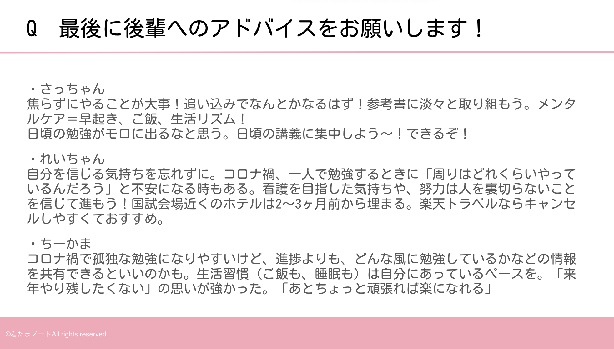 2月26日に開催された【国家試験直後の先輩に聞く!】看護師国家試験スタートダッシュ講座では、上のような看護師国家試験に対しての疑問を解消しようという目的で企画しました。「イベントに参加することはできなかったよ〜」という方でも大丈夫!