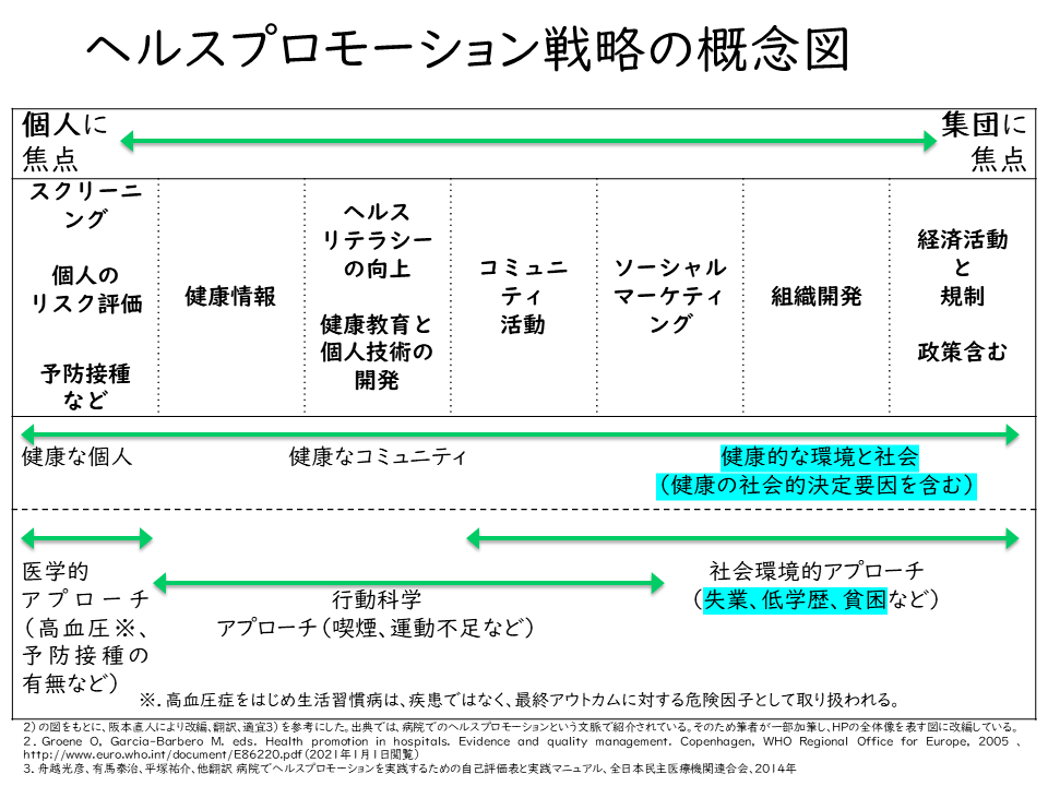 具体的に上げるなら、たとえば、慢性的な片頭痛持ちの人が、痛みがあるたびに鎮痛薬を服用するなど医療の力を借りて対処していたとします。ヘルスプロモーションのアプローチで考えると、医療的なケアだけで対処するのではなく、本来、頭痛になりやすい自分(自身)の傾向に気づいてセルフケア能力を獲得するといった、生活者のヘルスリテラシーが向上できるようなアプローチも必要でしょう。また、国民全体のレベルで健康を考えれば、長時間労働や不適切な雇用形態に起因する健康問題に対しては、政策レベルで職場環境にアプローチする戦略も含まれるのだろうと考えました。