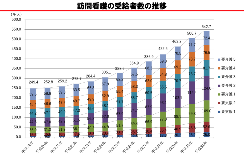 このように、看護職の就業場所でみると、訪問看護師はまだ多くはありません。また、訪問看護の事業所数も利用者(受給者)数は増加傾向にあり、高齢化や病院の在院日数の短縮化の流れを受け、ますますニーズは高まるものと考えられます。