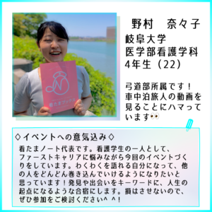 ひとりではキャリアについて考え続けにくいということは、これまで出会った看護師さんから伺ったきました。ひとりで思い悩むだけでなく、悩みをシェアしたり、他の人の相談したり、実際に現場を見に行ったり、内省も発信も、両方の活動が大切なのだろうと感じています。一緒にキャリアを考える仲間を見つけたい、キャリアを考える大切さを共有したい、という人にとって良い機会になったら良いと思います。キャリアに迷っている人はもちろん、キャリアに迷っていなかった、あまり考えたことなかったという人にも来て欲しいです。楽しいからとりあえずおいでよ、という気持ちもありますね。